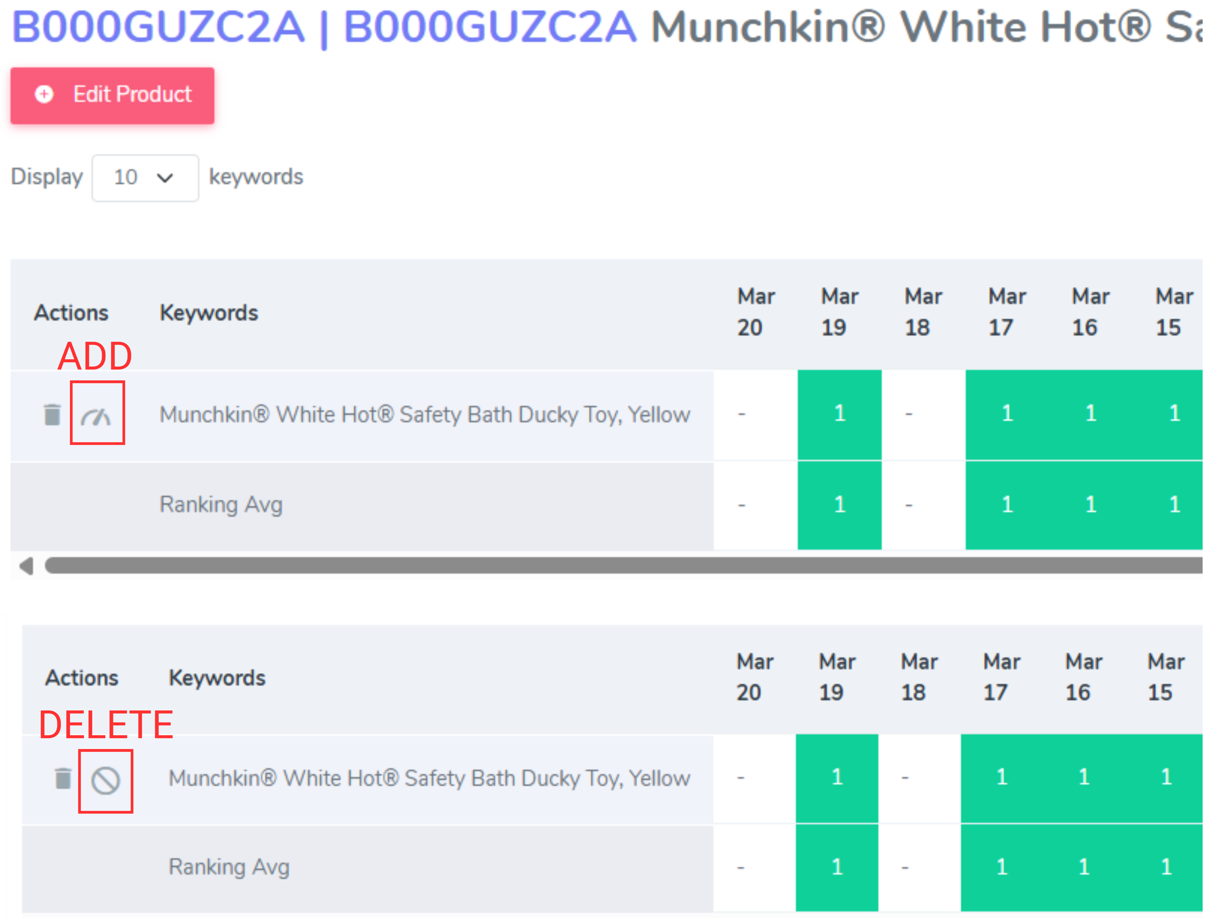 2. From your Keyword Tracking page (under Analytics), find the product ID you want to track on your dashboard. Open the product and choose the keyword(s) to add by clicking the gauge (add) button under the Actions column.