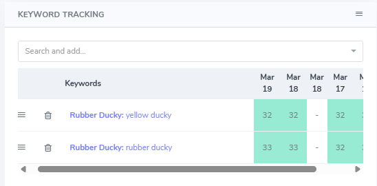 Changed your mind and want to remove a keyword or move it down the list? The 3 lines beside the keyword allows you to drag and drop the list, and the trash can allows you to remove it from your dashboard.