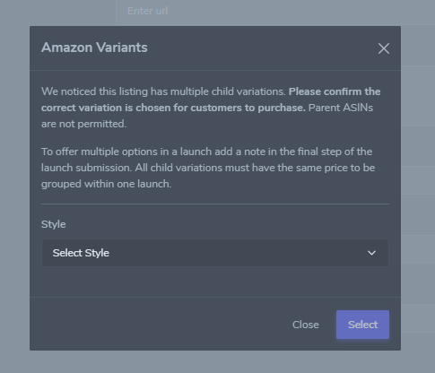 If you are adding a child or parent ASIN from Amazon you will receive the below prompt where you will be required to pick 1 child ASIN. We require each child ASIN to be added separately into your account, and parent ASINs are not permitted. For more information on how to setup your launch campaign(s) for Amazon product variations click here.
