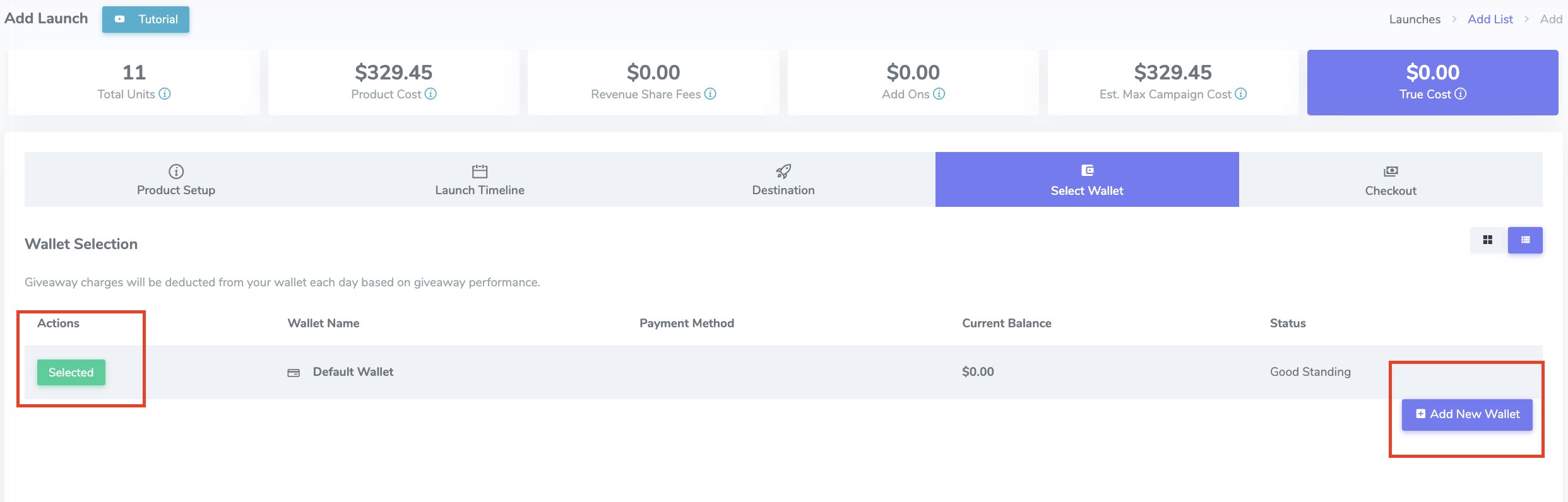 On the Wallets step, you can select a wallet to use for the launch. If you manage multiple brands and want to separate charges, you can add a new wallet for each brand.