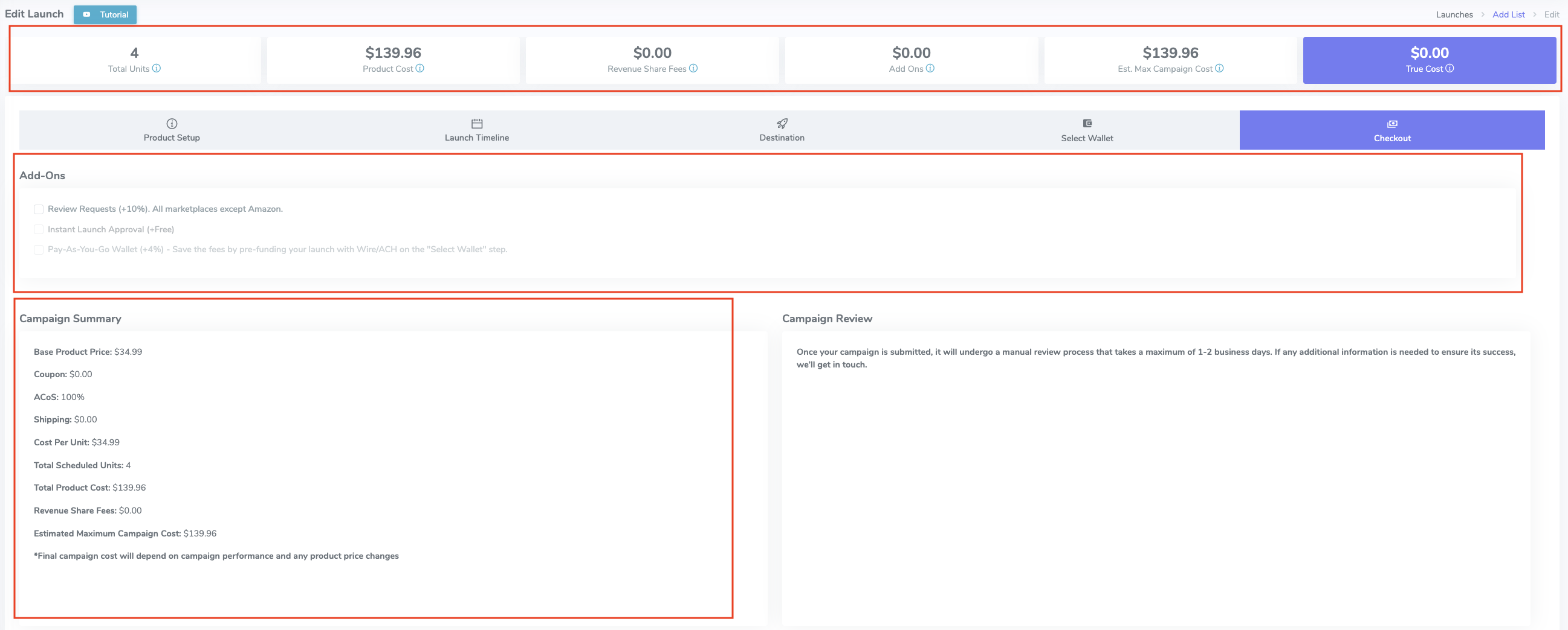On the Checkout page, you'll see a price breakdown, a campaign review that will alert you of any issues, notes section, and terms of use.