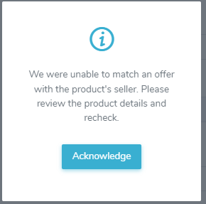 When the system identifies an error with your offer (Sold By), a prompt will appear for your review. Click "acknowledge" to examine the error.