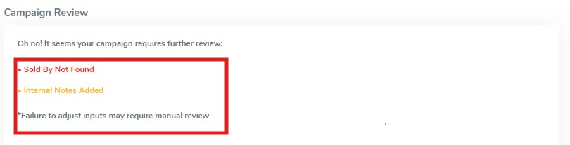 Manual launch review: If an internal note is added or any discrepancies are detected, a prompt will appear in the campaign review section, requiring manual review from our Success team.