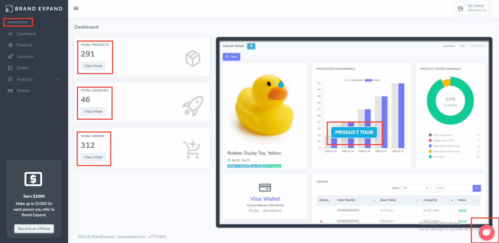 The Dashboard serves as the main page for the Brand Expand account. On the left side, you will find the navigation, a summary of the total number of products, launches, and orders. Clicking "view more" will take you to the detailed lists of your products, launches, and orders. On the right side, there is a "product tour" section. These interactive tours provide step-by-step guidance on using Brand Expand. Just choose the feature you want to explore and follow the instructions accordingly.