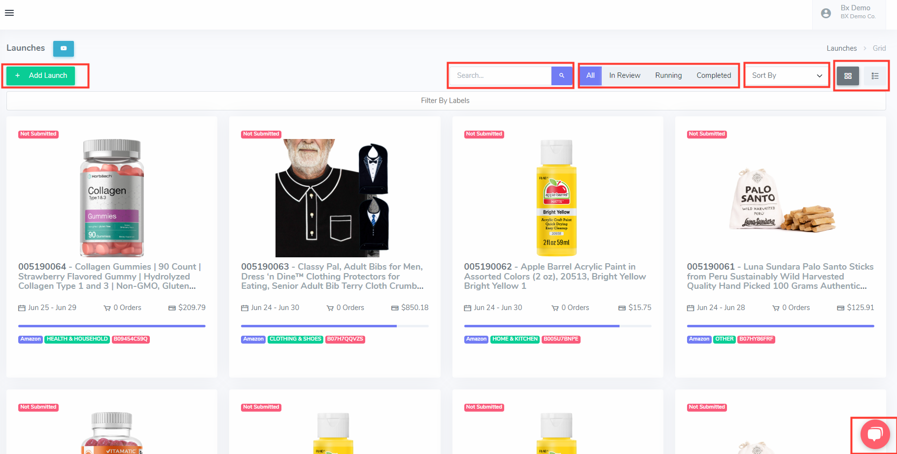 For better organization, you have the option to sort your launches using the "Sort By" feature. Furthermore, you can customize the display style of the launches by clicking on the two icons located in the top right corner of the screen. Choose between the Grid and List options based on your preference.