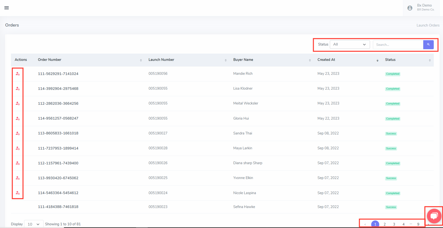 The "Orders" page displays a comprehensive list of all orders associated with the launches you have created. It provides essential information about each order, including order numbers, launch numbers, buyer names, creation dates, and order statuses.