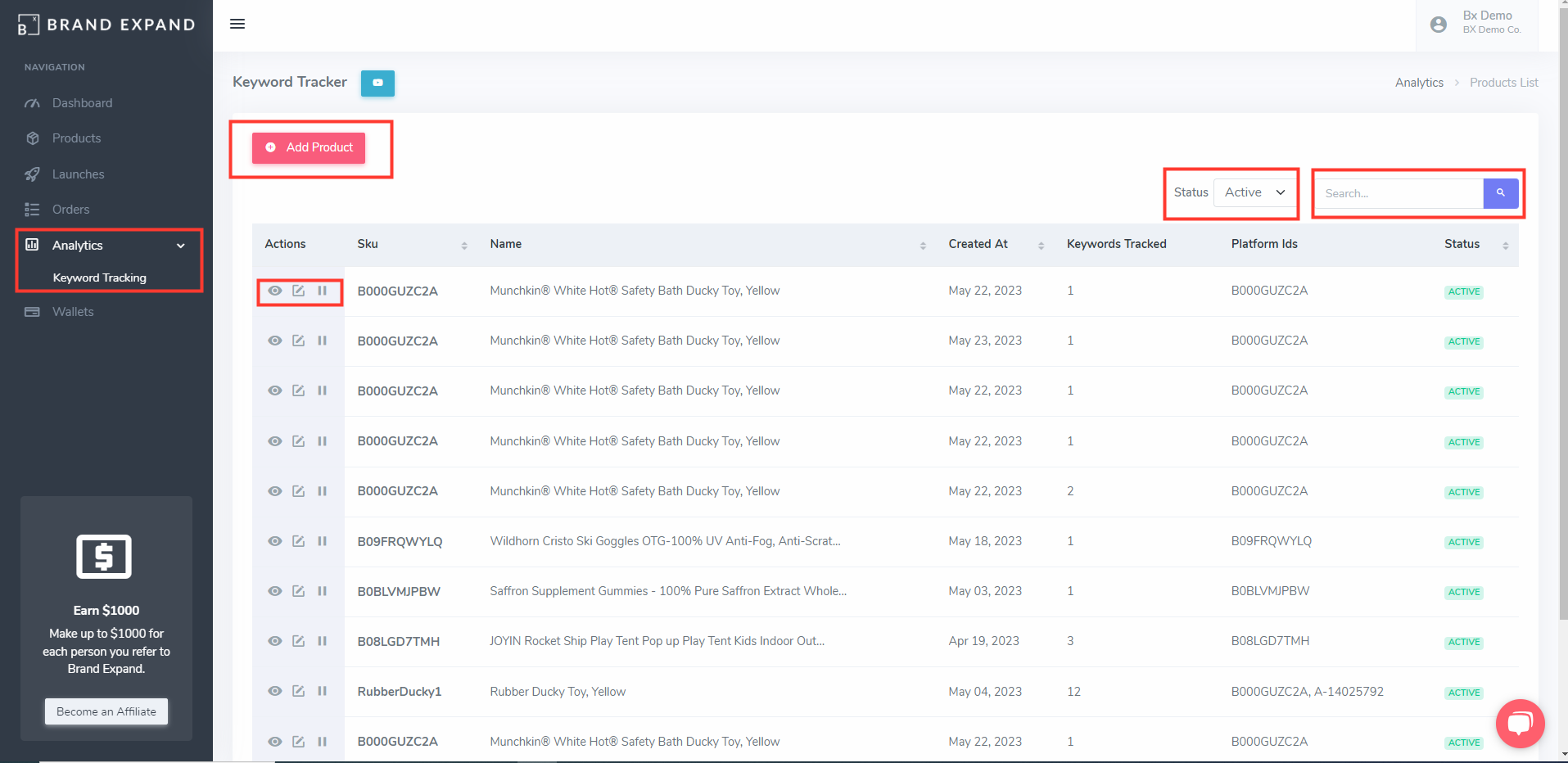 Head to your Analytics tab in your account and select Keyword Tracking. From here, you will see a list of all the current tracking we are keeping an eye on for you. You can hit the RED ADD PRODUCT button at the top of this list and add your Product ID/ASIN and the keywords you would like to see the rank for. Hit Save and the tracking will begin.