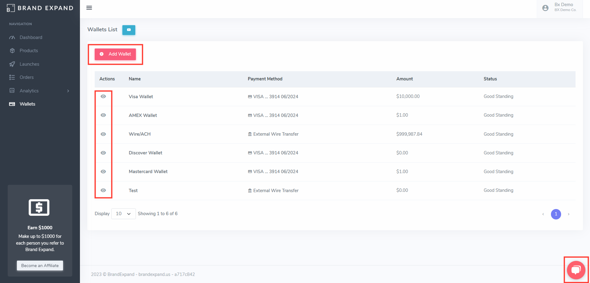 The wallet is where funds are drawn from for the duration of product launches. You will be able to see the wallet details and transactions by clicking the View eye icon under actions.