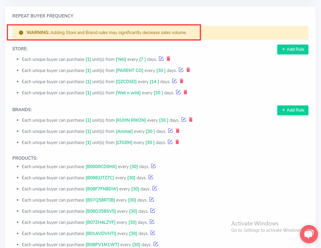 Within the Repeat Buyer Frequency feature, you can establish rules for your campaigns on a product, brand, and store level. This function enables you to specify the number of days that must pass before a buyer from our network can purchase again.
