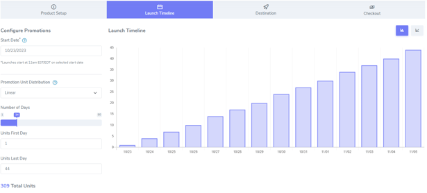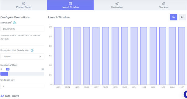 Linear distribution is characterized by an organic progression of promotional unit releases during the launch. The number of promotions per day increases gradually as the launch progresses. This mimics customer behavior, where a product becomes more relevant and visible over time. This is often referred to as a staircase launch campaign. Here is an example of a linear unit distribution: