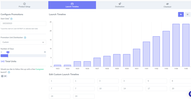 Custom distribution provides sellers with the flexibility to tailor their promotional strategy to their specific needs. Sellers can choose the duration of the product launch and specify the number of promotional units they want to release per day. This allows for a personalized approach that may vary depending on the product, goals, and market conditions. Here is an example of a custom unit distribution: