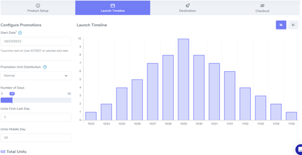 Promotion unit distribution in the launch timeline tab of launch setup refers to the way in which a seller allocates or distributes promotional units (sales) during a launch. There are four types of promotion unit distributions to choose from: Uniform, Custom, Linear, and Normal.